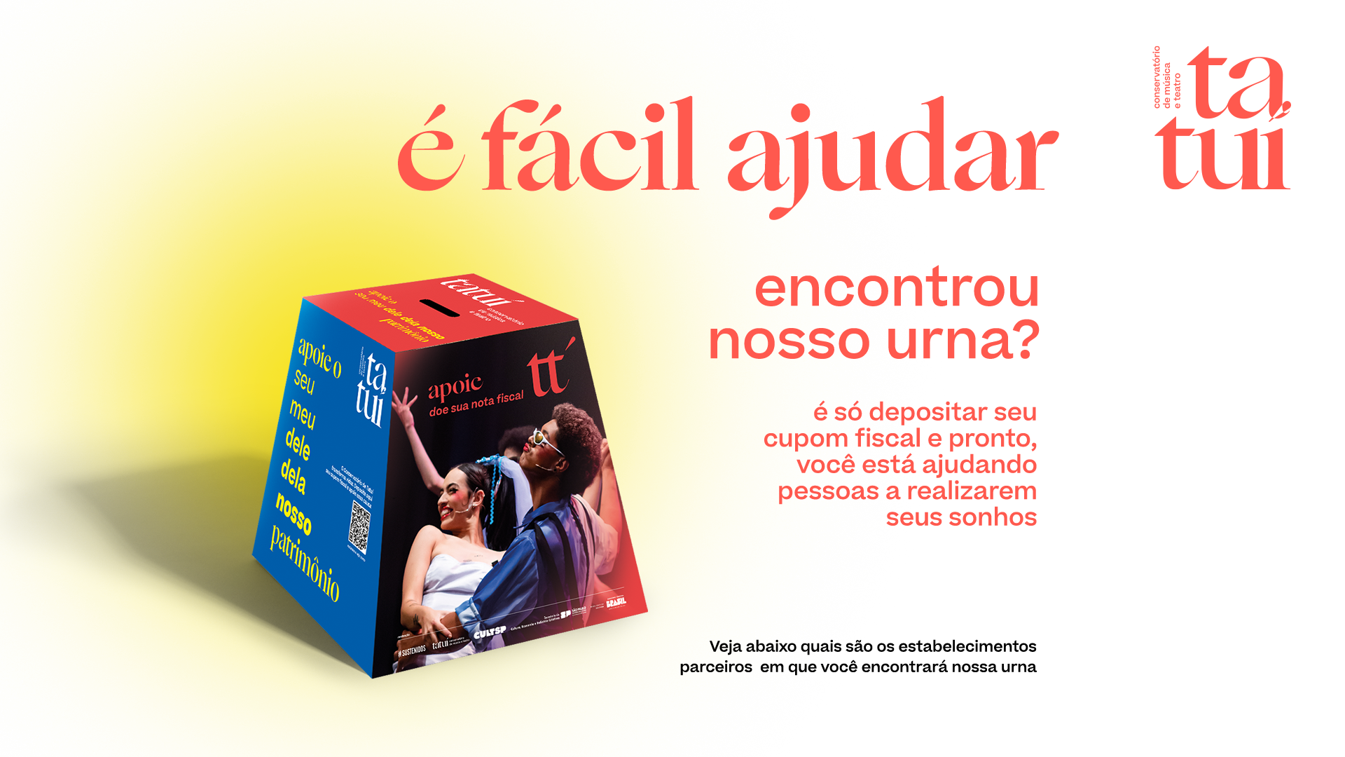 Sabia que você pode ajudar o Conservatório de Tatuí a transformar vidas por meio das notas fiscais e dos cupons fiscais de compras simples do seu dia a dia? É muito simples fazer parte dessa história, basta depositar os cupons fiscais das suas compras nas urnas espalhadas no comércio, em apoio ao Conservatório de Tatuí. Não vai custar nada para você e a instituição receberá créditos pelo programa Nota Fiscal Paulista do governo de São Paulo.   Fundado em 1954, o Conservatório de Tatuí é considerado a maior escola de música e teatro da América Latina e tem o compromisso de oferecer ensino profissionalizante gratuito e de excelência, contribuindo para a inserção de jovens no mercado de trabalho e para a economia criativa do País.   Com mais de 70 anos de atuação, a instituição já formou grandes artistas, que hoje se destacam no mercado nacional e internacional, seja como músicos(as), atores/atrizes em grandes produções, seja como educadores e multiplicadores de conhecimento.   Clique na imagem e veja mais sobre a grandiosidade desse projeto.